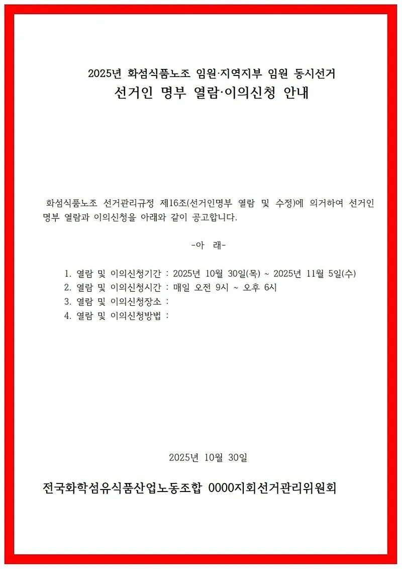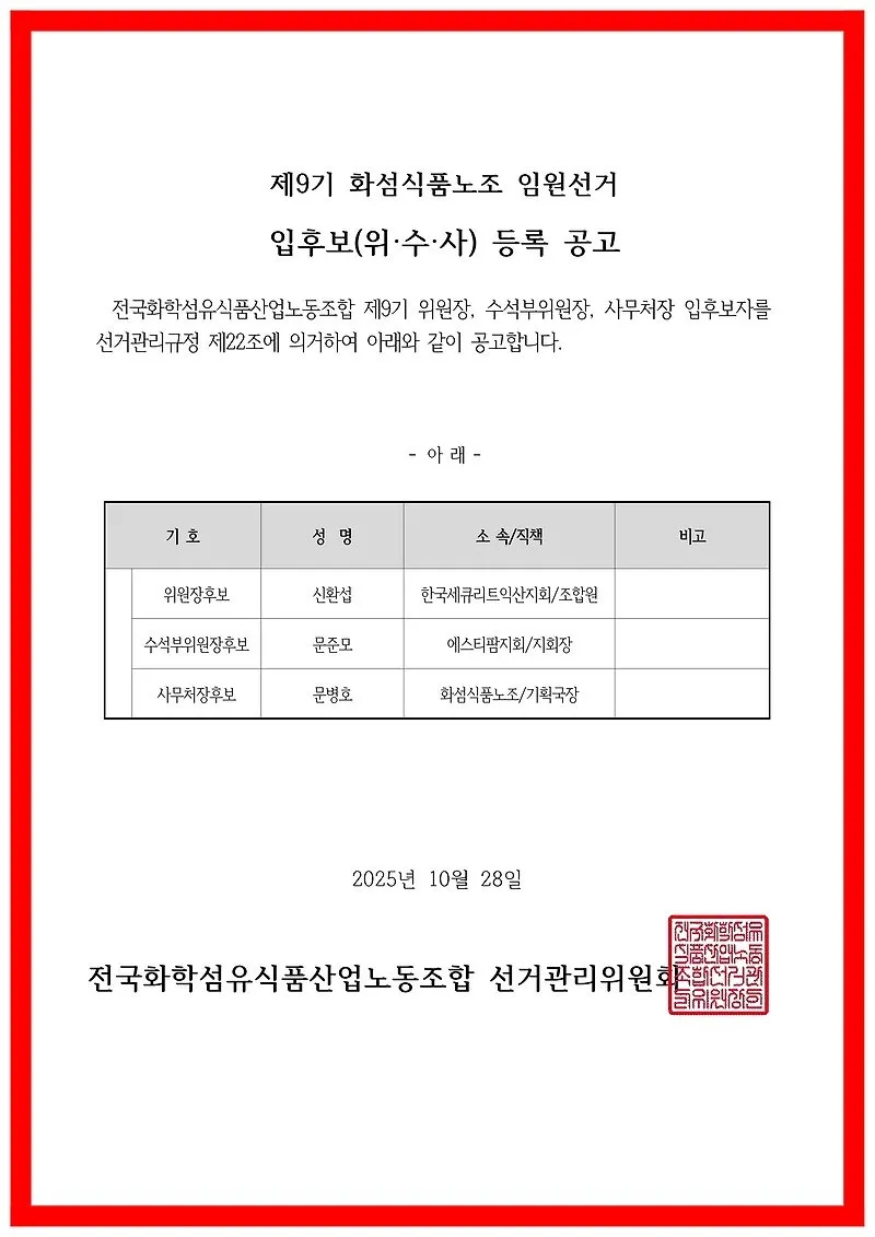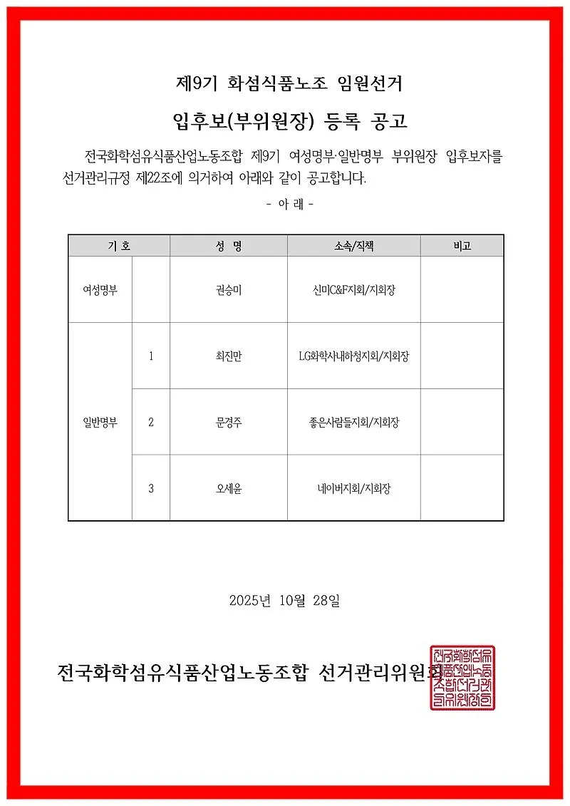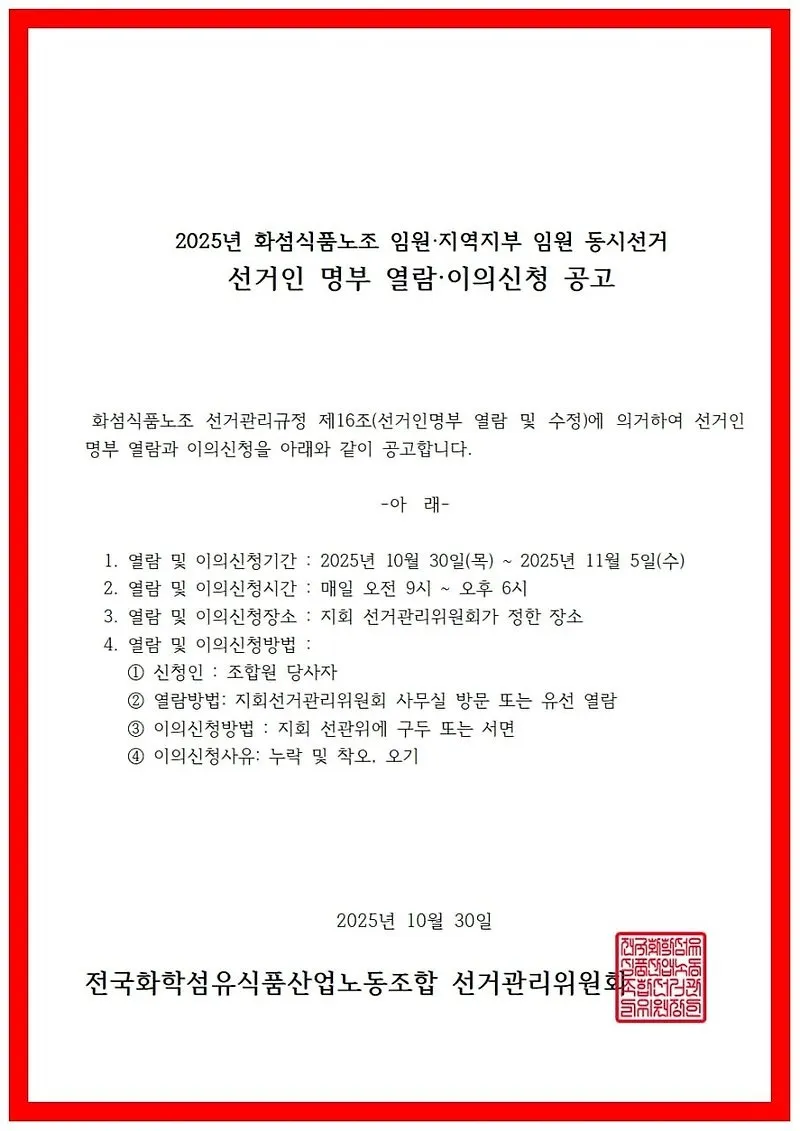 제9기 화섬식품노조 임원선거 입후보 등록 공고(열람.이의신청 공고)