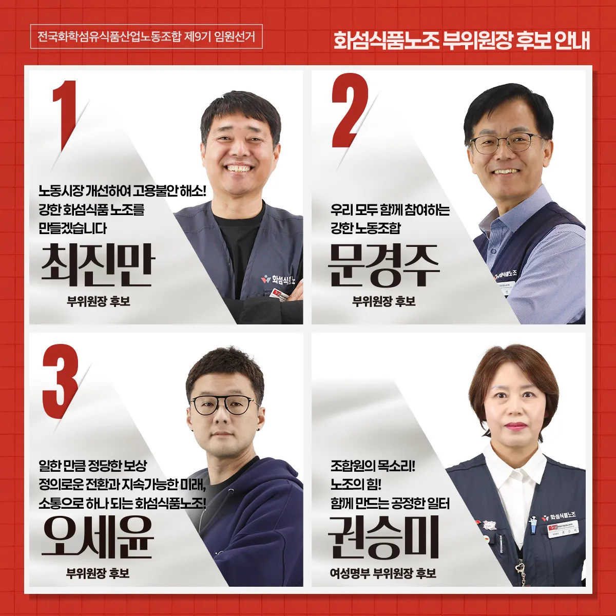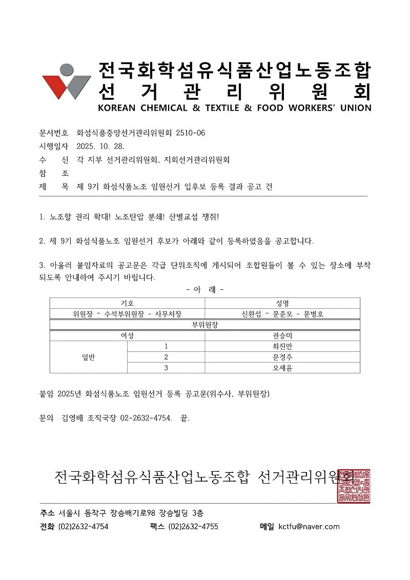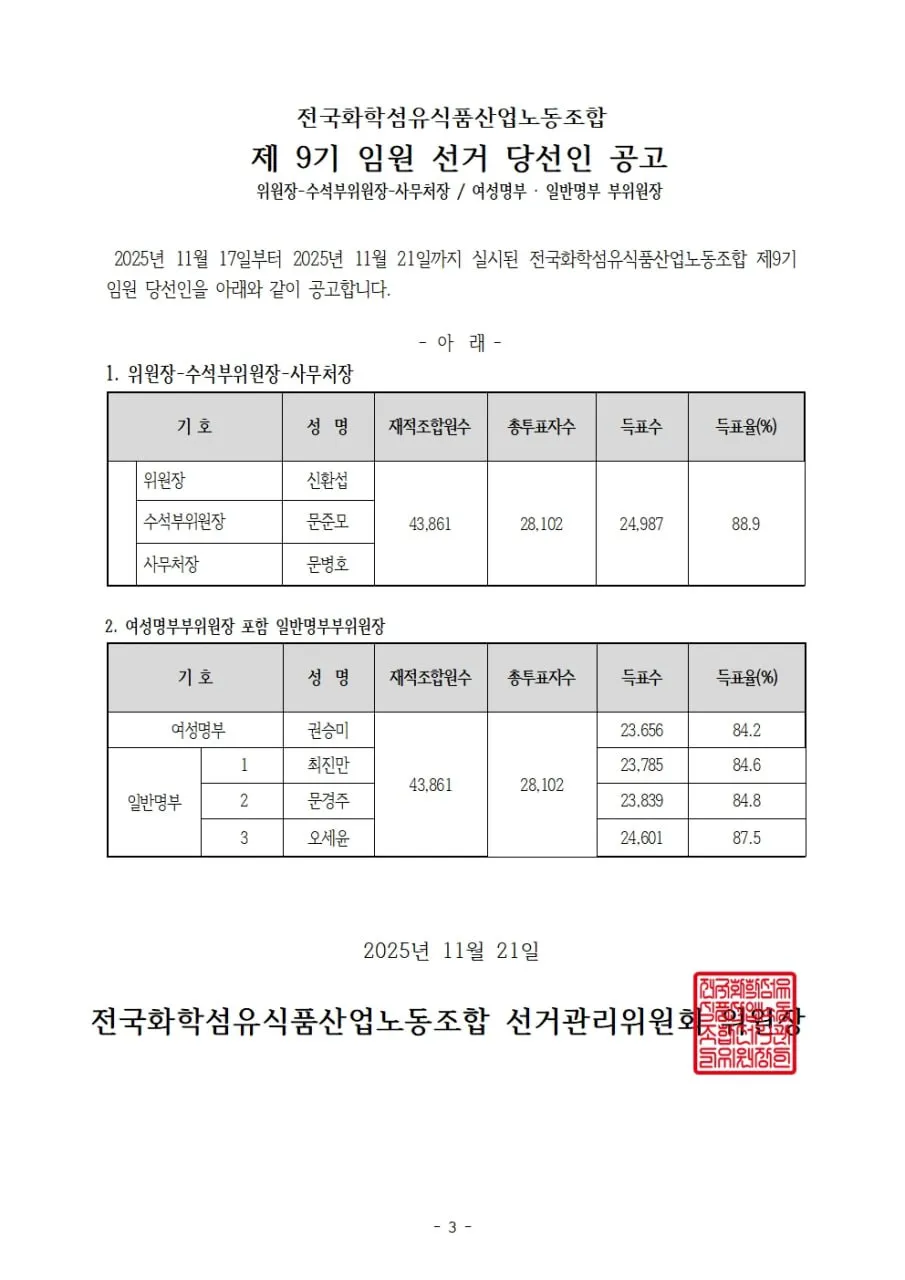 제9기 화섬식품노조 임원 선거 당선인 공고