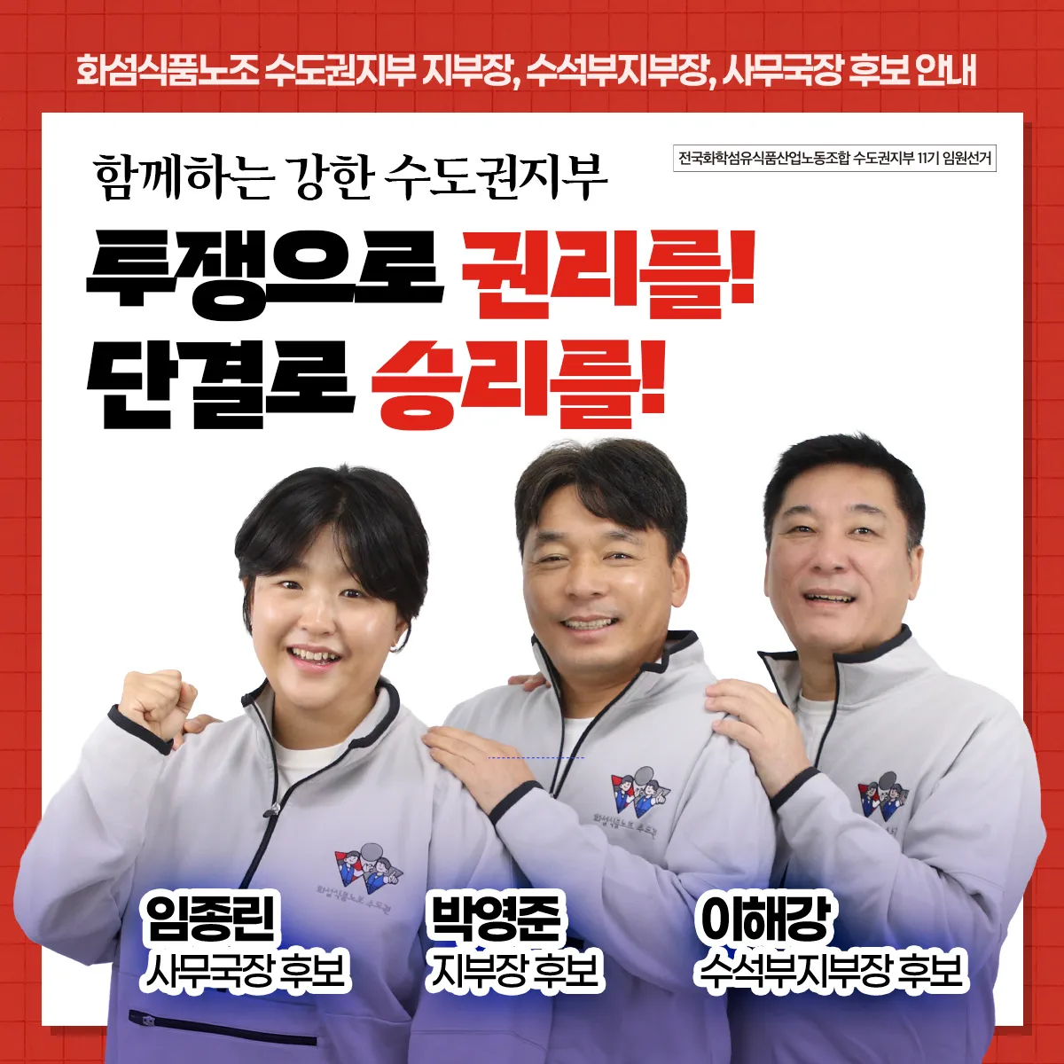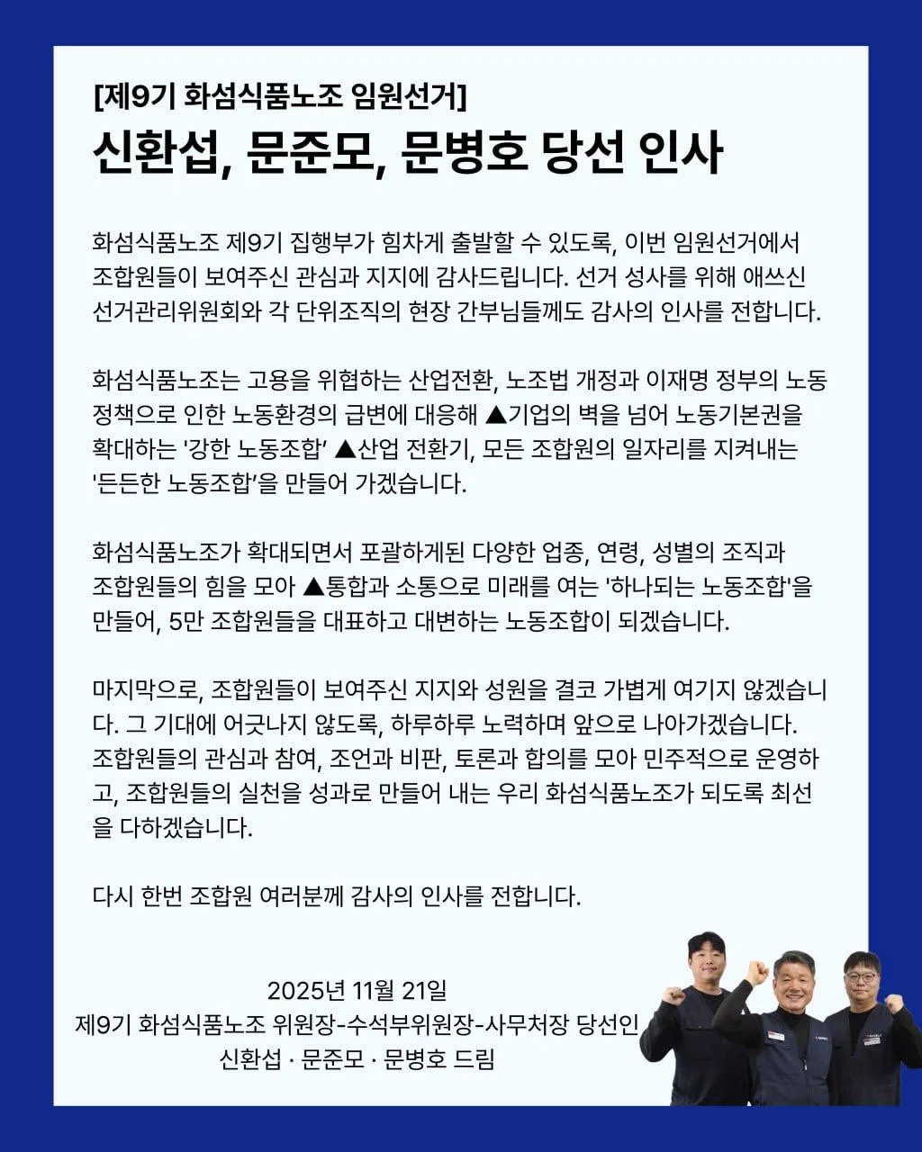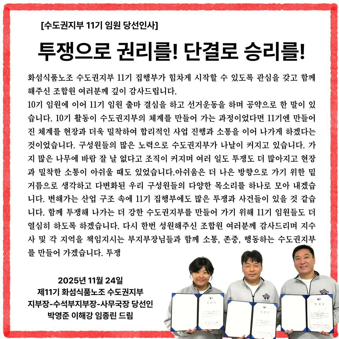 제9기 화섬식품노조 임원 선거 당선인 공고