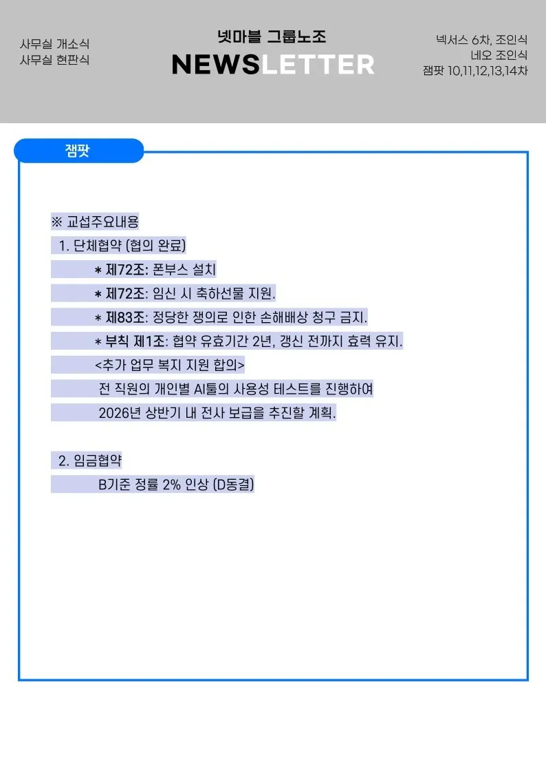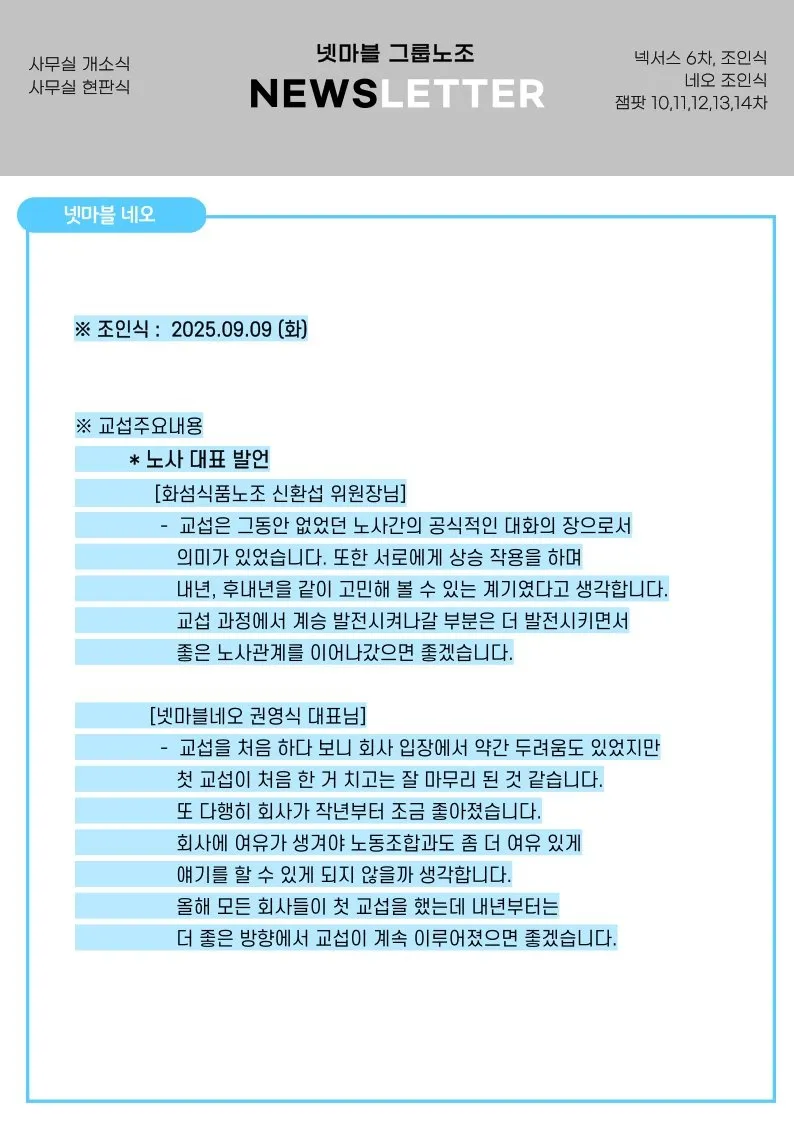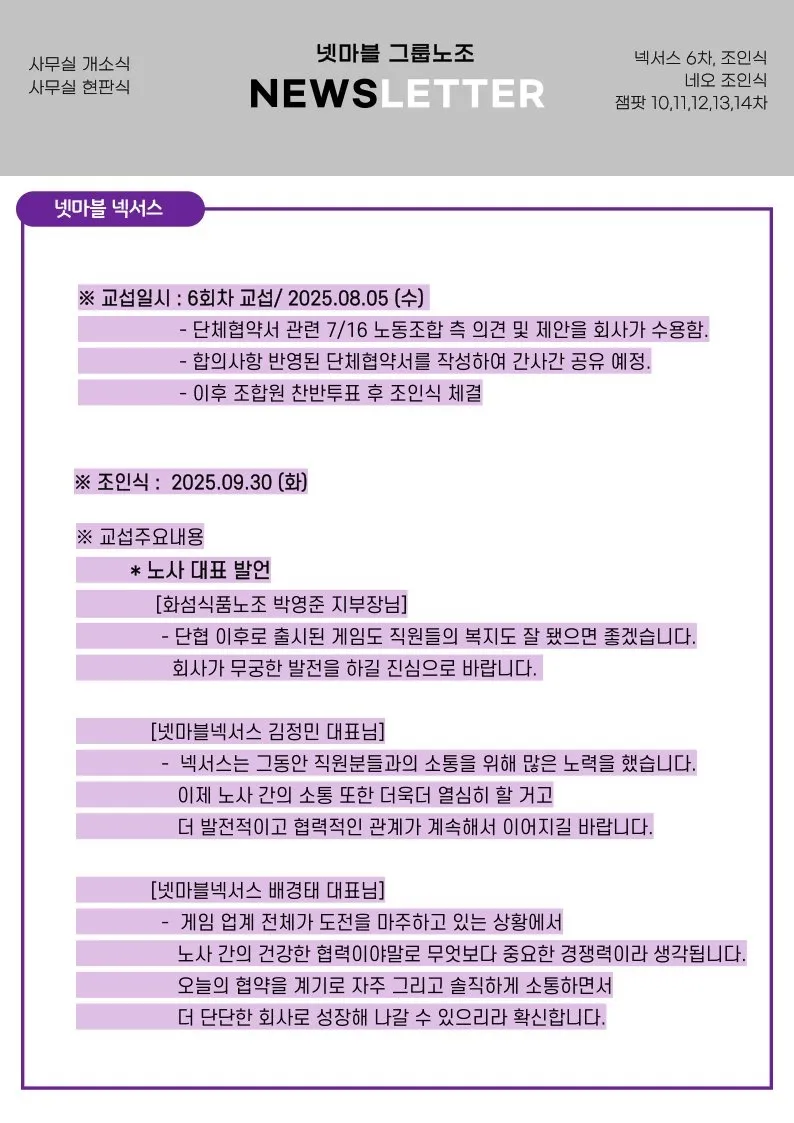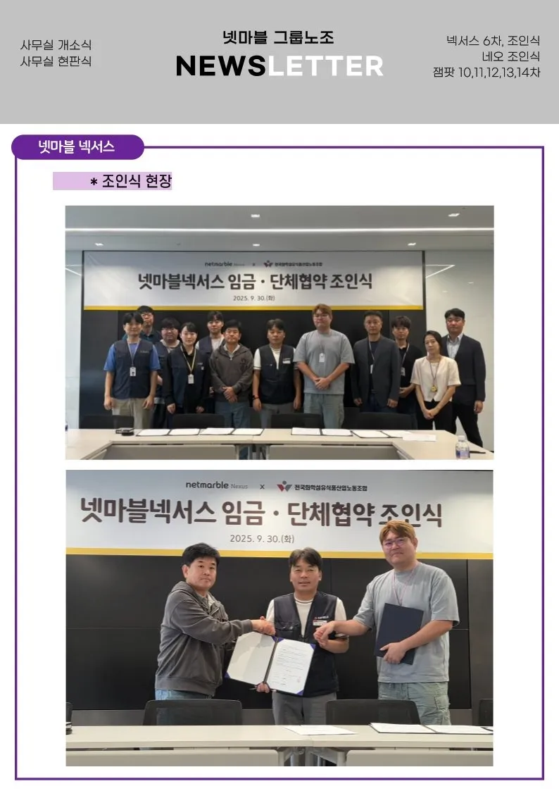 또한, 넷마블넥서스와 넷마블네오가 단체협 조인식을 가졌습니다.